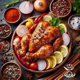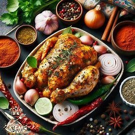 الوصف: دجاج مطهو في الفرن باستخدام تتبيلة هندية تحتوي على مجموعة من البهارات التي تمنحه طعماً شهيًا وملمسًا طريًا.